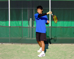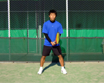 ボールを打つ前、待っているときの姿勢を「構え」と言います。足は肩幅に開き膝を軽く曲げて、どこにボールがきても反応できるようにしましょう。
