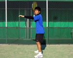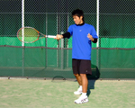 最近の主流の持ち方です。イースタンとウエスタンの中間に合わせます。少しラケット面が下に向いてきます。