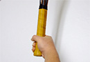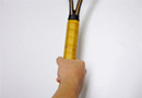 ラケットを地面に対し垂直になるように左手で持ち、右手をラケット面に当てます。そのまま右手をグリップまで下げて軽く握ります。このとき、強く握らずに卵を持つように優しく握るのがコツです。
